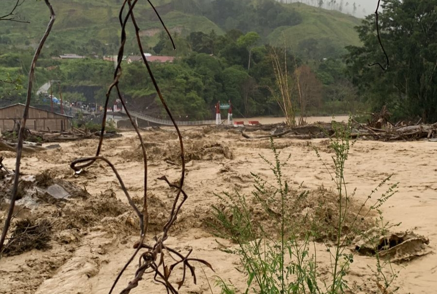 Debit air sungai meningkat drastis hingga meluap ke permukiman. Air bah datang tiba-tiba sambil membawa lumpur, kayu, hingga bebatuan.