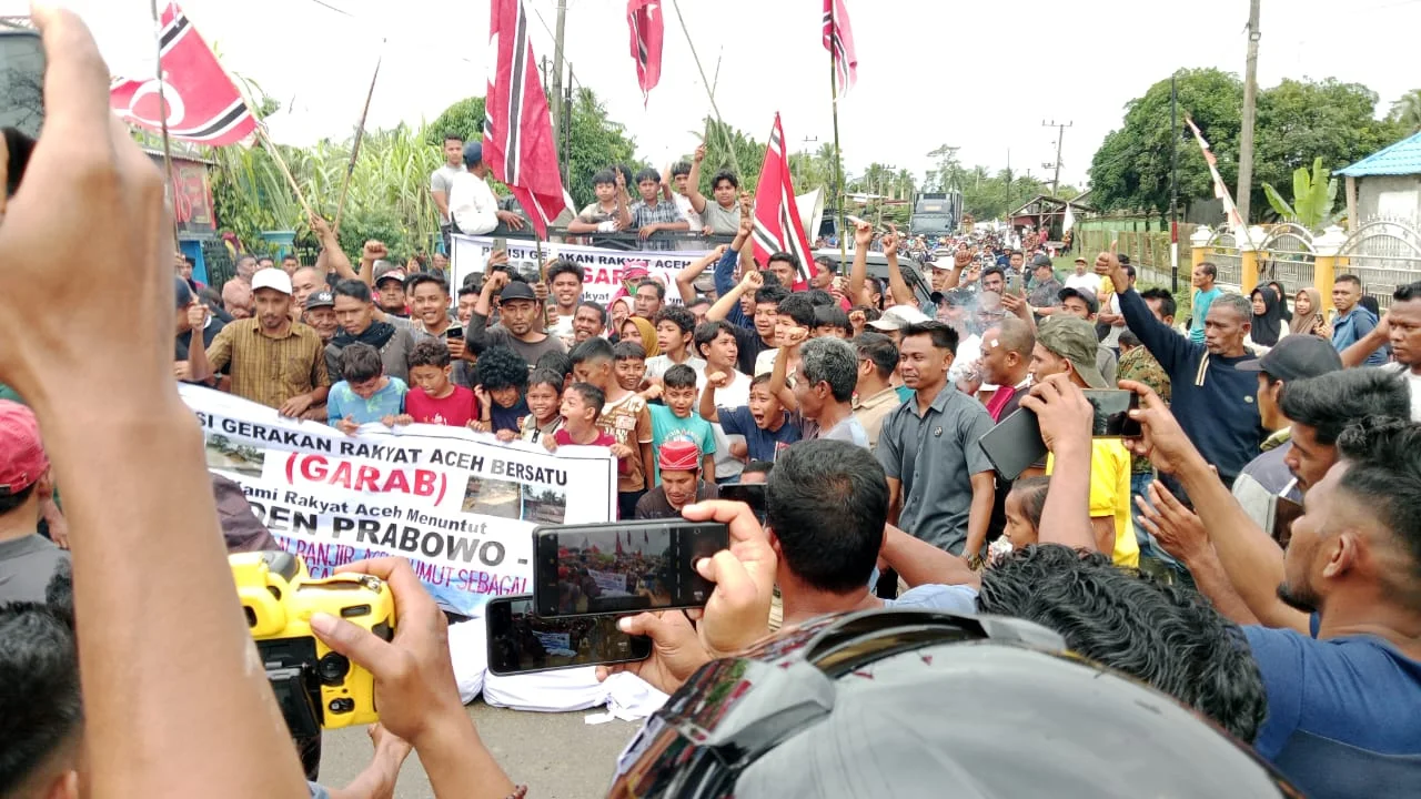 Aceh Timur | Ribuan warga Aceh Timur yang tergabung dalam Gerakan Rakyat Aceh Bersatu (GARAB) menggelar aksi demonstrasi besar-besaran dengan membawa bendera Bintang Bulan, di Kecamatan Madat, Kabupaten Aceh Timur, Selasa (16/12/2026).