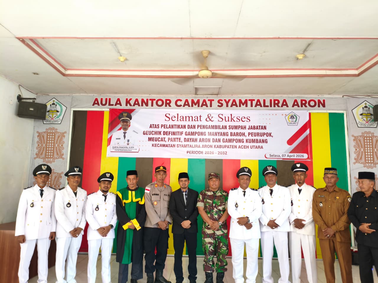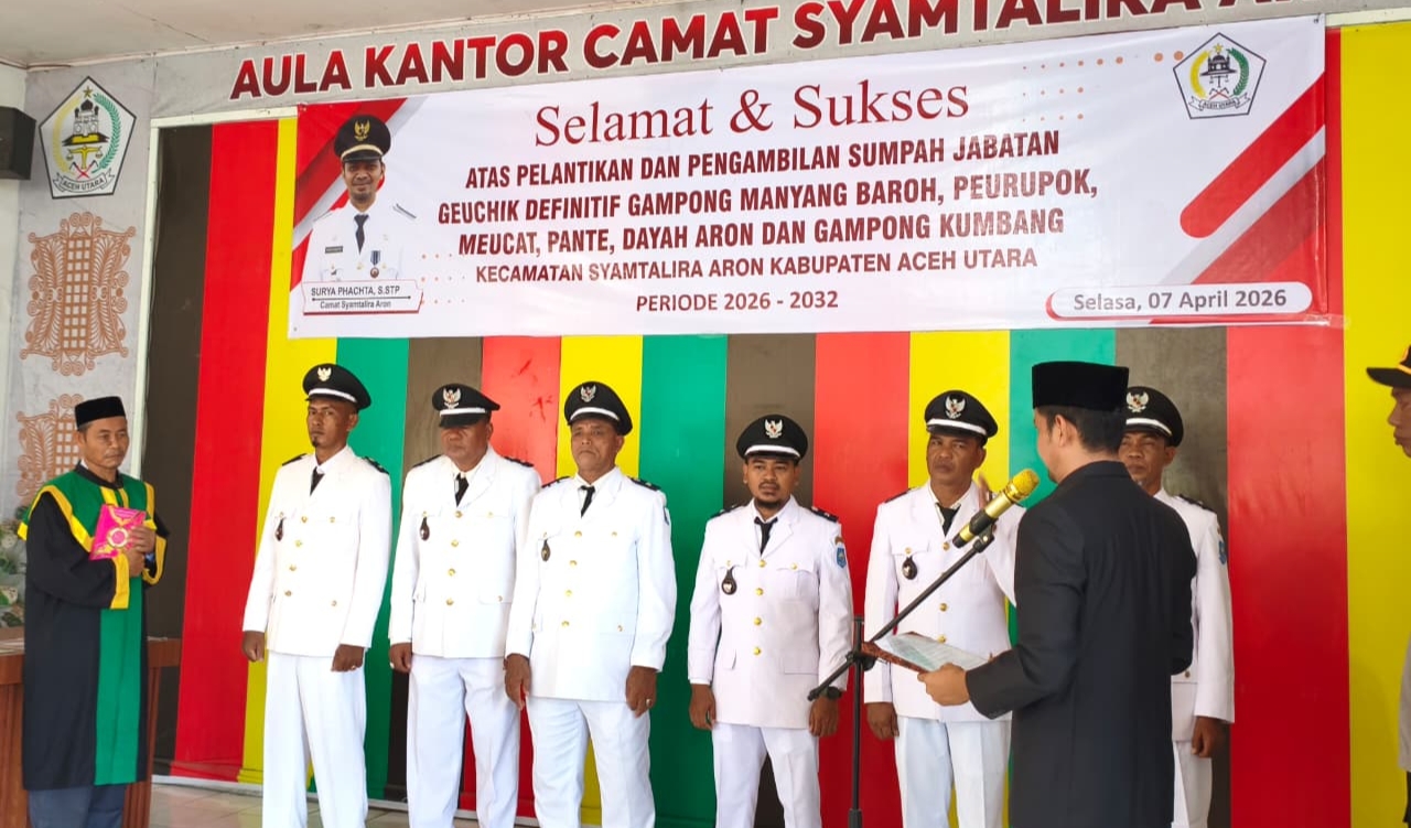 ACEH UTARA | Camat Syamtalira Aron, Surya Phachta, S.STP, resmi melantik dan mengambil sumpah jabatan enam Geuchik (Kepala Desa) definitif untuk periode 2026–2032. Prosesi pelantikan berlangsung khidmat di Aula Kantor Camat Syamtalira Aron, Kabupaten Aceh Utara, Selasa (7/4/2026).