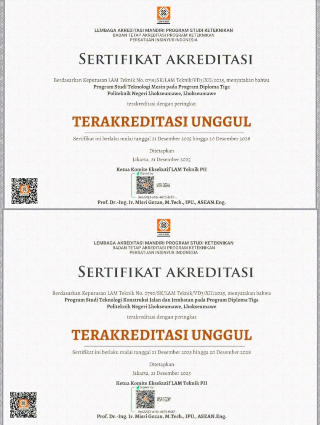 Lhokseumawe, 21 Desember 2025 – Di tengah tuntutan industri yang kian selektif dan pasar kerja yang terus berubah, akreditasi tidak lagi sekadar stempel administratif. Ia menjadi tolok ukur apakah pendidikan vokasi benar-benar melahirkan tenaga terampil yang relevan atau sekadar memenuhi standar di atas kertas. Di titik inilah Politeknik Negeri Lhokseumawe (PNL) menempatkan capaian terbarunya: dua program studi diploma tiga, Teknologi Konstruksi Jalan dan Jembatan Jurusan Teknik Sipil serta Teknologi Mesin Jurusan Teknik Mesin resmi menyandang akreditasi Unggul dari Lembaga Akreditasi Mandiri (LAM) Teknik PII.