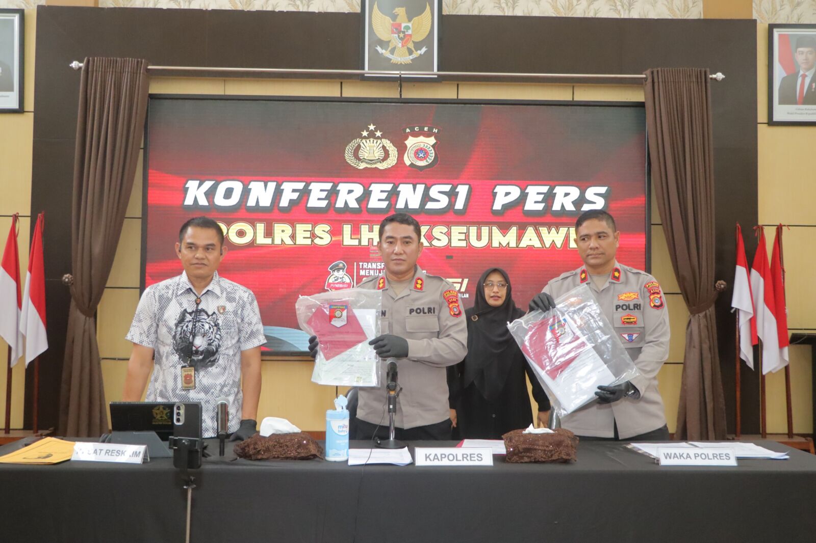 Pengungkapan kasus ini disampaikan dalam konferensi pers yang dipimpin Kapolres Lhokseumawe AKBP Dr. Ahzan, S.H., S.I.K., M.S.M., M.H., didampingi Wakapolres Kompol Salmidin, S.E., M.M., serta Kasat Reskrim AKP Dr. Bustani, S.H., M.H., M.S.M., M.Si., M.Kn, di Gedung Serbaguna Polres Lhokseumawe, Rabu (8/4/2026) pagi, di hadapan sejumlah awak media.
