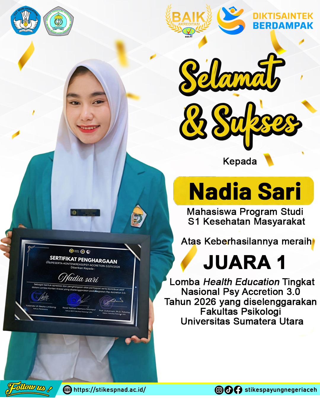Redelong — Kabar membanggakan datang dari dunia pendidikan kesehatan. Nadia Sari, mahasiswa STIKes Payung Negeri Aceh Darussalam, berhasil meraih juara pertama pada kategori health education (edukasi kesehatan) dalam ajang nasional Psy-Accretion 3.0. Ia juga menjadi satu-satunya perwakilan dari Aceh yang dinobatkan sebagai peserta terbaik di bidang edukasi kesehatan dalam kompetisi tersebut.