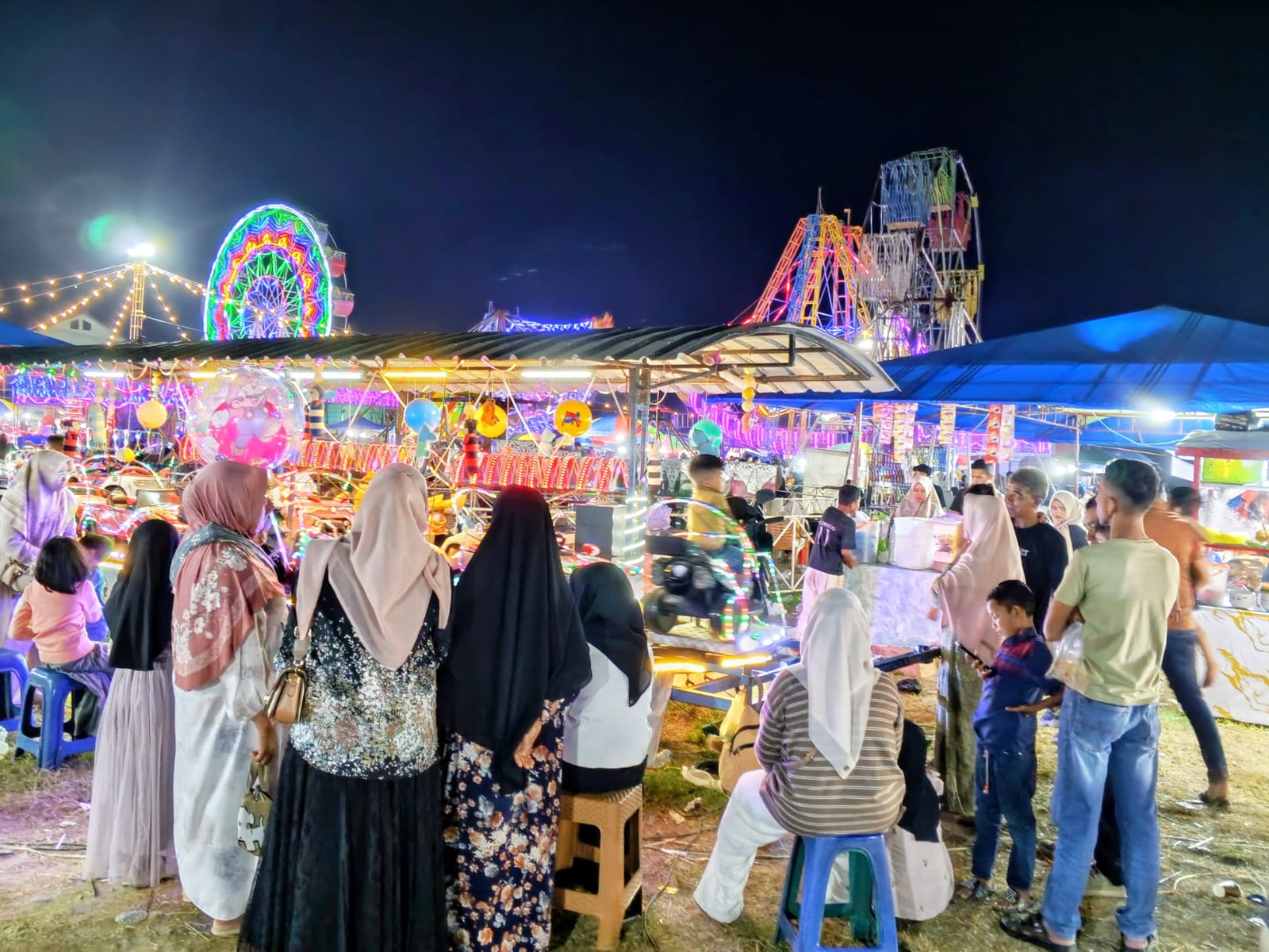 Terpantau pada malam minggu ini (25/4), area lapangan Keude Krueng Geukueh tak lagi muat menampung laju kendaraan. Ribuan lampu dari stan pedagang kuliner, pakaian, mainan anak, hingga wahana permainan tradisional menyala terang, menciptakan suasana festival yang meriah sejak pukul 19.00 WIB hingga larut malam.
