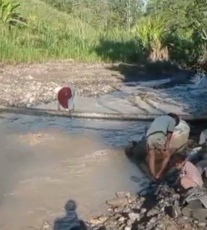 Dalam video yang beredar luas, terlihat seorang ibu rumah tangga dengan berani melintasi batang pohon pinang yang digunakan sebagai akses alternatif untuk mencapai kebunnya.