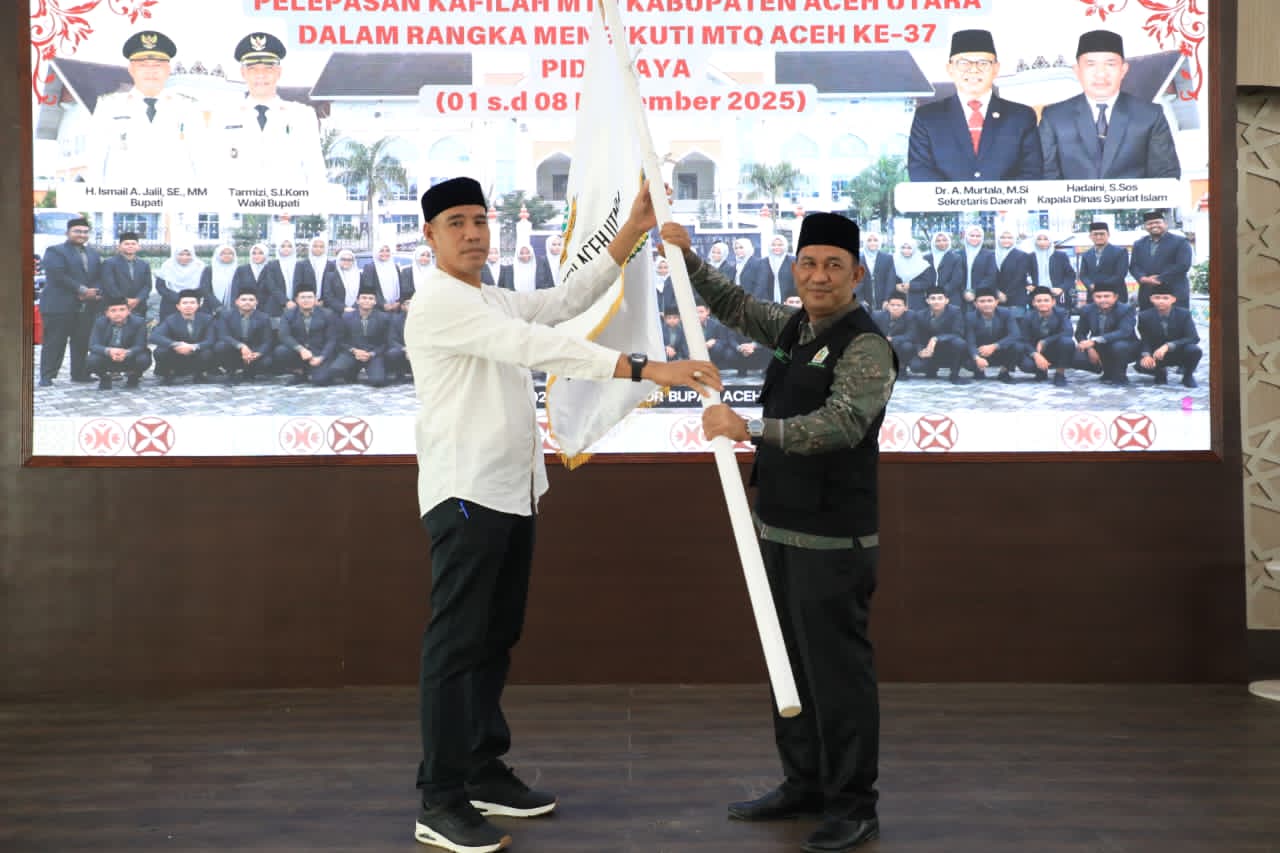 Acara pelepasan berlangsung di Aula Kantor Bupati Aceh Utara, Jumat (31/10/2025), dipimpin oleh Wakil Bupati Aceh Utara, Tarmizi, S.I.Kom, yang akrab disapa Tarmizi Payang. Prosesi pelepasan ditandai dengan penyerahan bendera kafilah kepada Ketua Kafilah, Hadaini, S.Sos., yang juga menjabat sebagai Kepala Dinas Syariat Islam Kabupaten Aceh Utara.