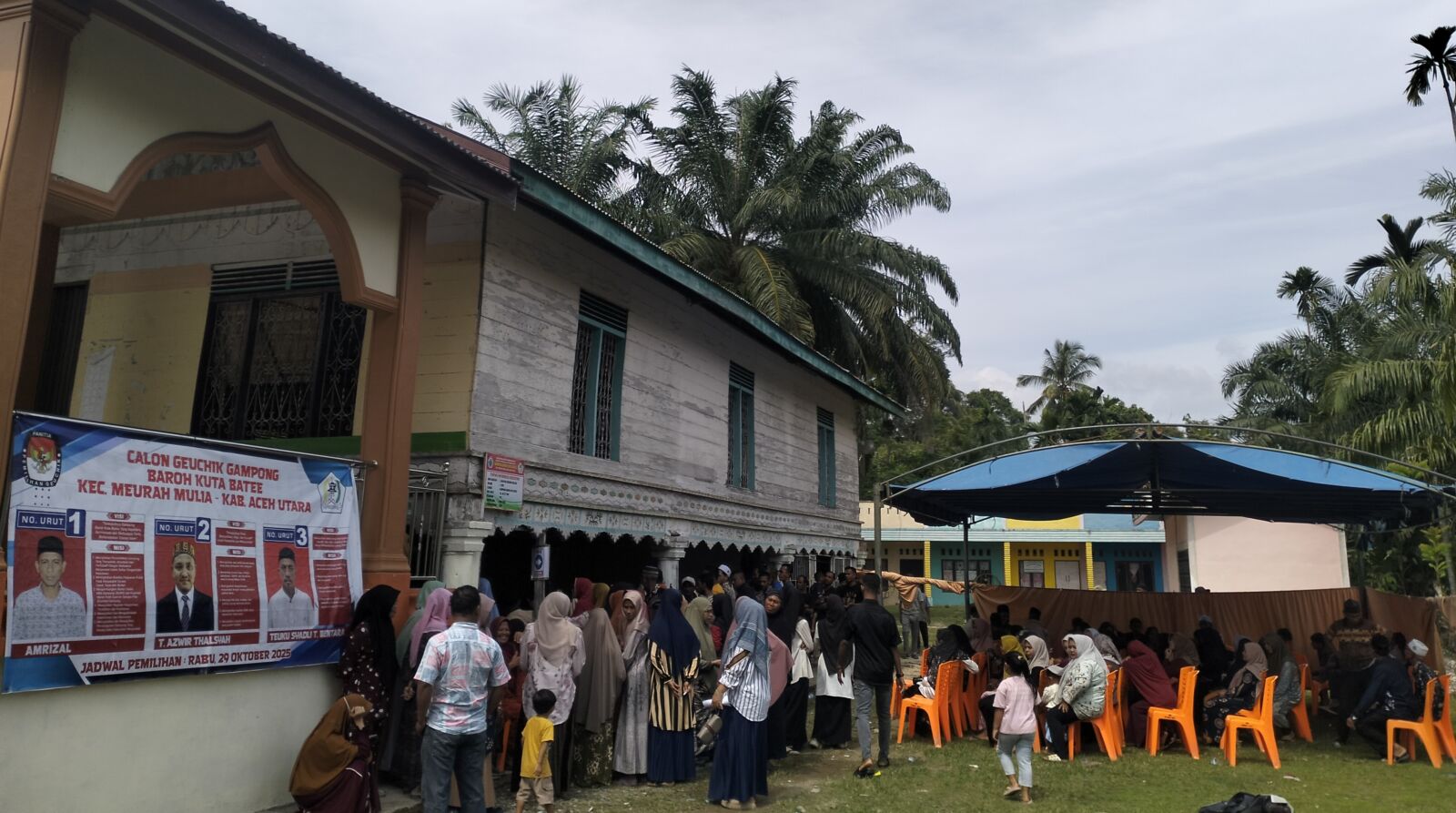 GENTAPOST.COM – ACEH UTARA | Warga Baroh Kuta Batee, Kecamatan Meurah Mulia, Rabu (29/10/2025). Sejak pagi, ratusan warga sudah berdatangan ke halaman meunasah tempat berlangsungnya Pemilihan Geuchik (Pilchik) untuk periode 2025–2031.